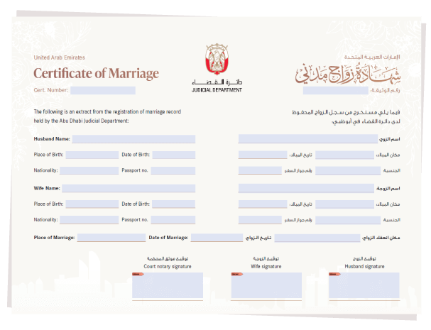 The marriage registration process in Abu Dhabi includes submitting the necessary documents and application, arranging a wedding date with the ADJD, and obtaining your official marriage certificate after the ceremony.